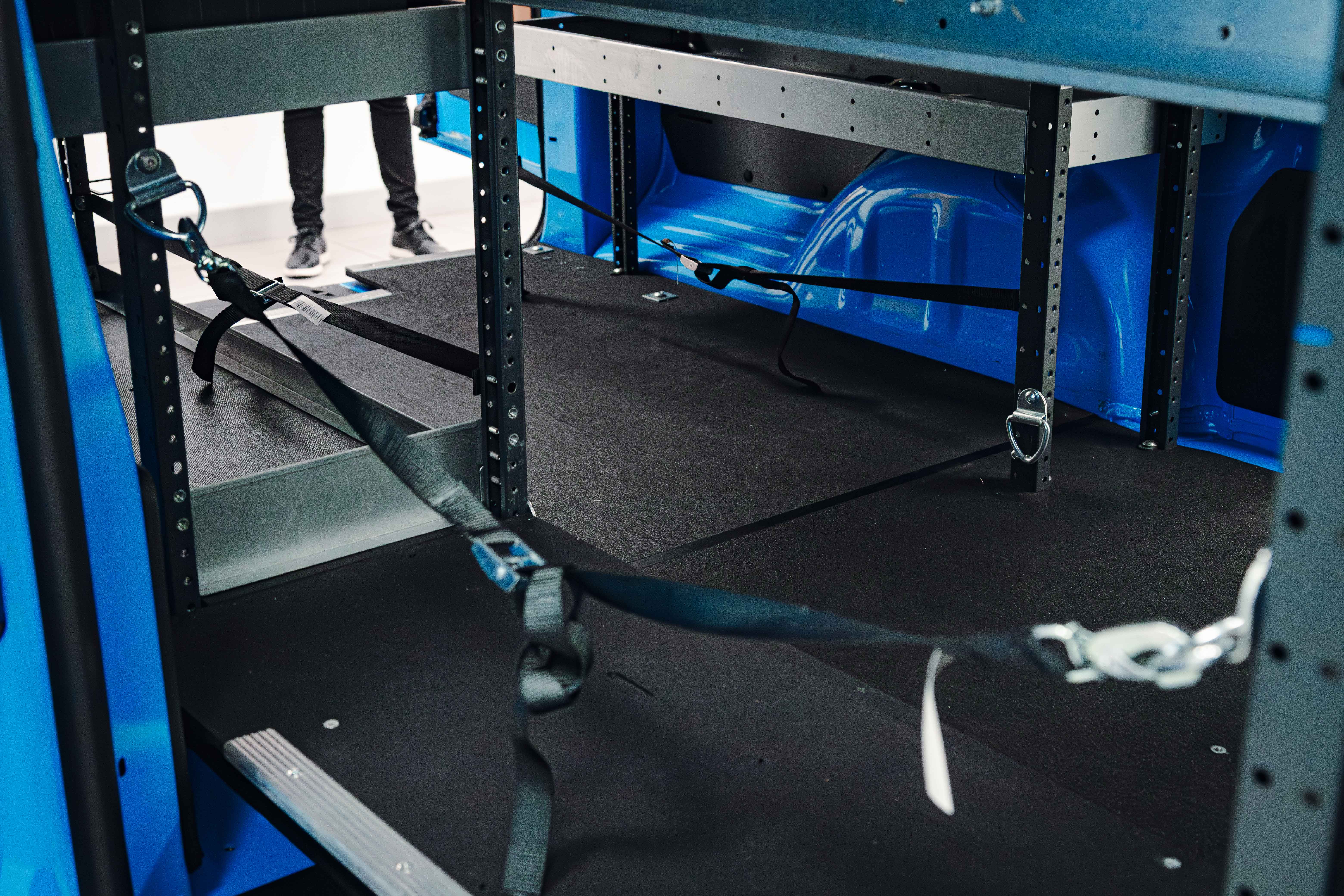 EVOLVE is a lightweight floor specifically designed to reduce payload in electric vans by reducing the weight of StabiliGrip (and similar weighted birch coated plywood floors) by 53%. EVOLVE has a little bit more give, so it’s slightly less rigid. It comes with crash-tested no-drill fasteners so you can fasten the floor and shelves to the floor, and the floor holds the fasteners in.